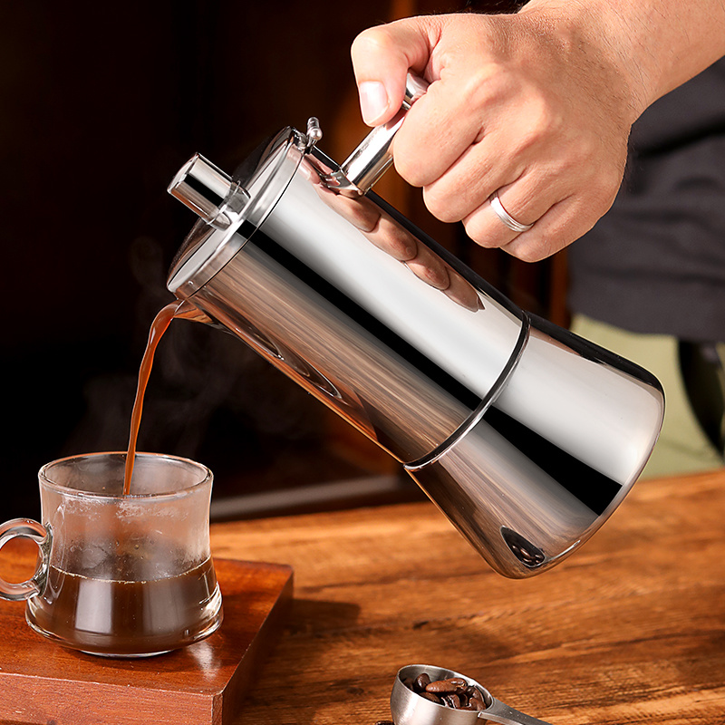 Mirror Finish Moka Pot: 4-Cup, 6-Cup, 9-Cup Sizes Available with Custom Logo & Gift Box Options for Home & Commercial Use